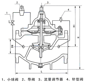 400X流量控制閥結構圖( 1.球閥 2.導閥 3.流量調節閥 4.針閥) |